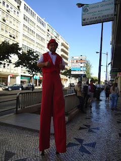 No final de tudo? Antes do Areeiro, a Alameda, espraiada em relva, apetecível neste dia ainda tão quente do Outono. E o homem das andas, vestido de vermelho, que se quis fotografar connosco, tão lá em cima.